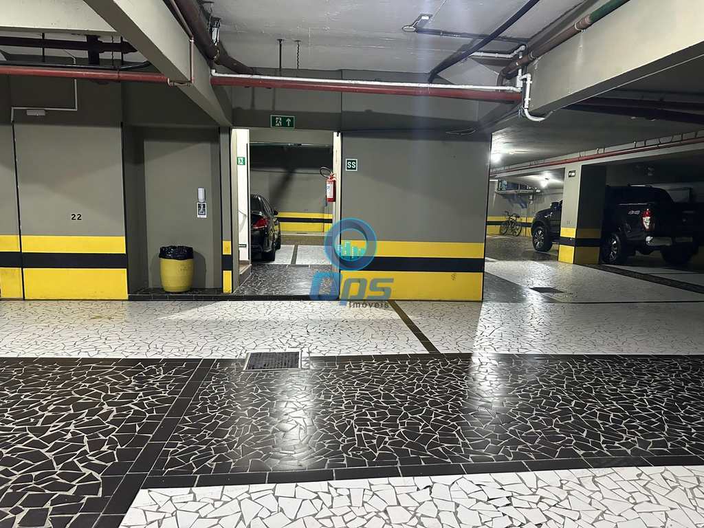 O apartamento dispõe de **02 vagas de garagem privativas** e o prédio oferece lazer completo, com **salão de festas, academia, sauna e bicicletário**.