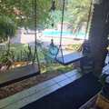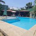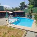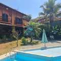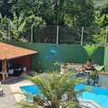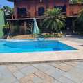 A piscina em concreto, com 50 mil litros, oferece três níveis de profundidade, um deck molhado, cachoeira, casa de máquinas, chuveirão e um banheiro exclusivo na área de lazer. Os jardins são adornados por árvores frutíferas, criando um ambiente natural e acolhedor.